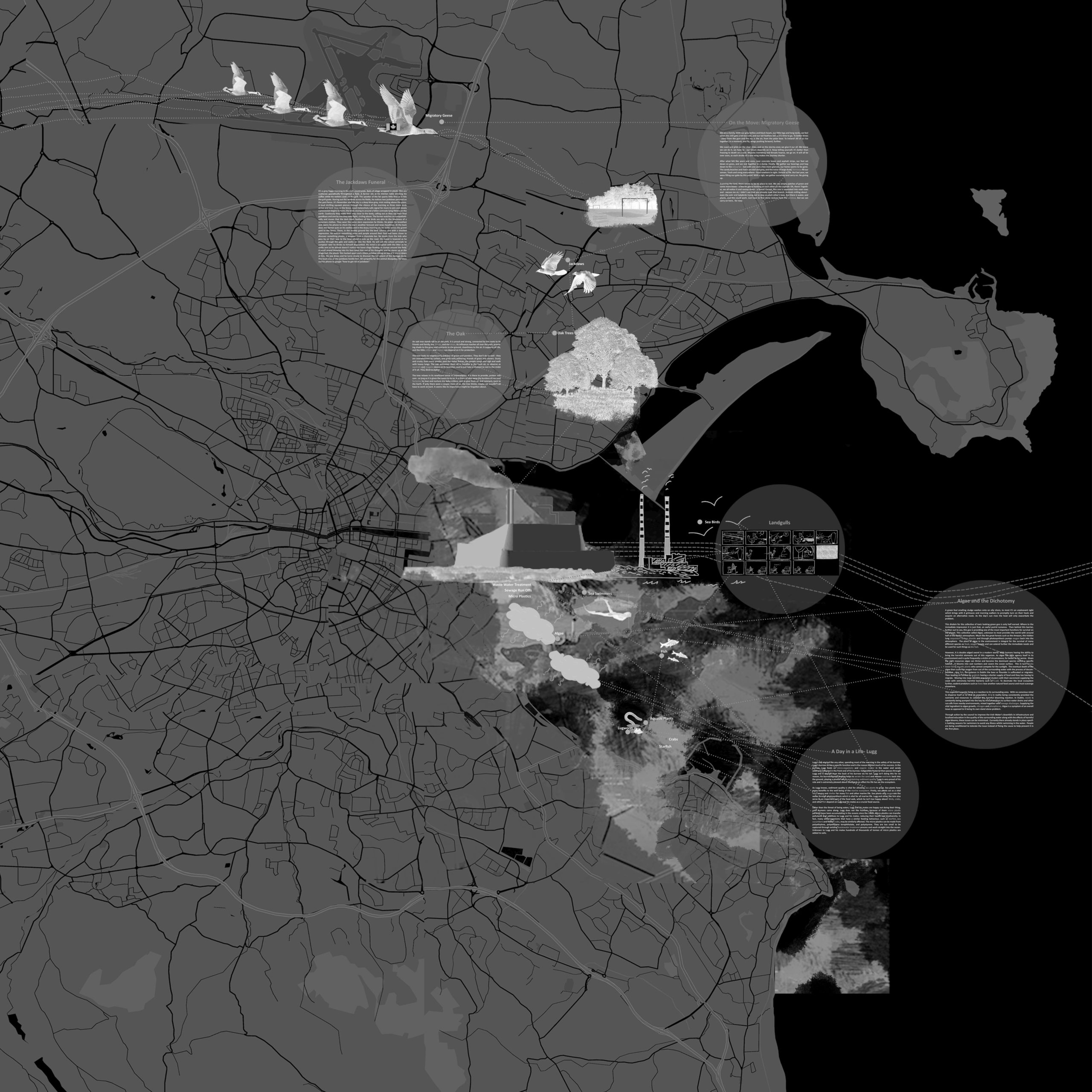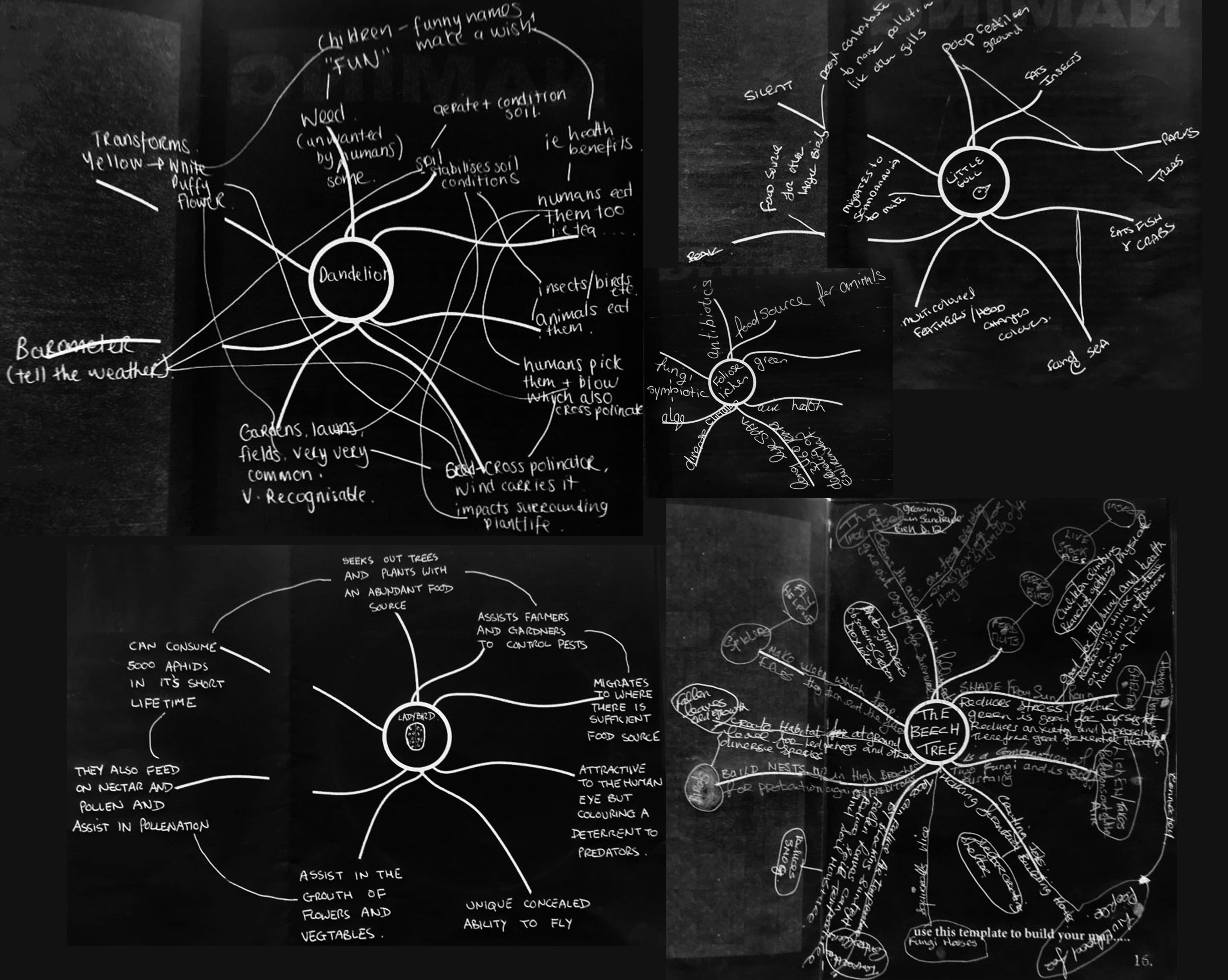The process begins with a grounding in ideas and theories to challenge our thinking. We then set out to explore our more than human environments and we used wayfaring (Ingold) as a method for gathering new knowledge and refocusing our awareness. Mapping is used as a way of understanding the meshworked nature of our worlds. Here we mapped out the relationships, connections and points of interaction that make up our complex interwoven environments. We looked then to challenge our western understanding of how things of this world are classified and drawing from folk taxonomies and indigenous ways of knowing, we set out to create new names for our more than human actors. The names we create aim to capture storied knowledges (Ingold) that can offer “real information about the ecological relations in the world” (Sinclair). Our final exercise is storytelling. We used storytelling as a tool for reflection, and as a container and communicator of the knowledge we gathered.
